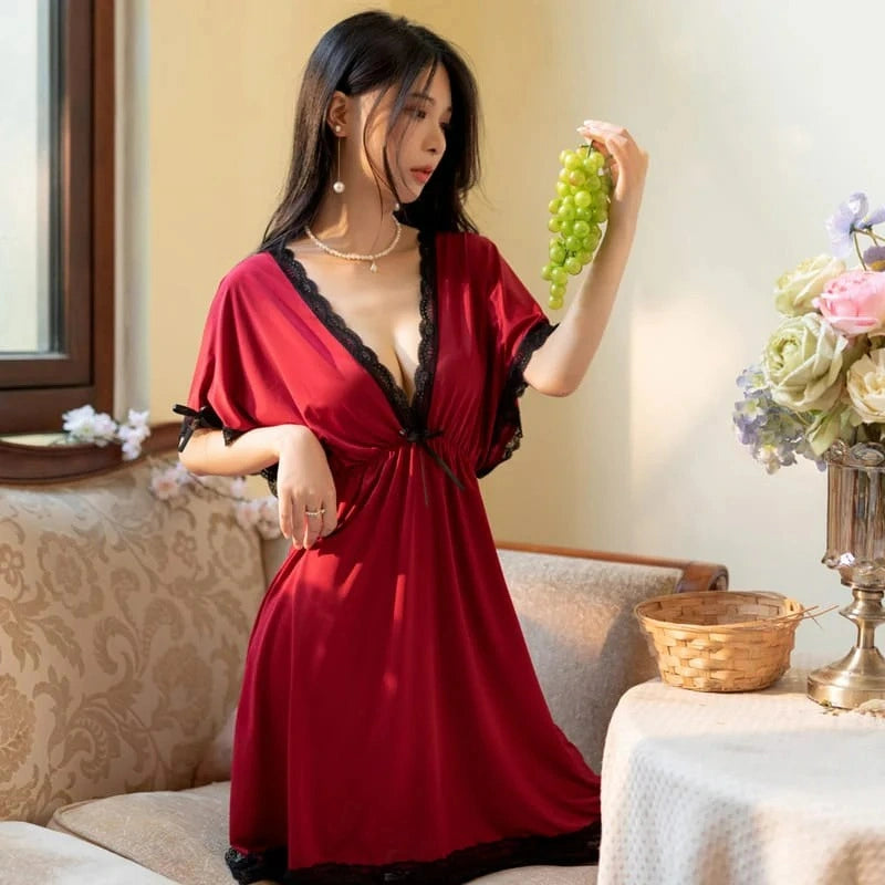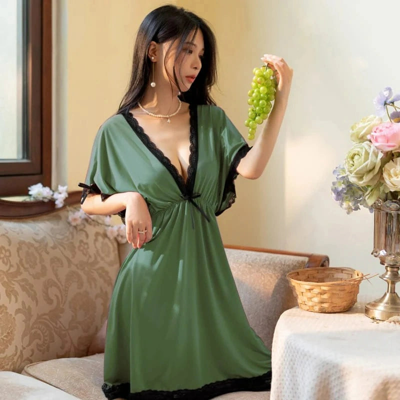 Amelira Drape is a soft, relaxed-fit nightdress designed with flowy kimono-style sleeves and a gently gathered waist. Elegant lace details line the neckline, sleeves, and hem, offering a refined finish. Lightweight and breathable, it’s made for comfort while maintaining a graceful silhouette for everyday wear.