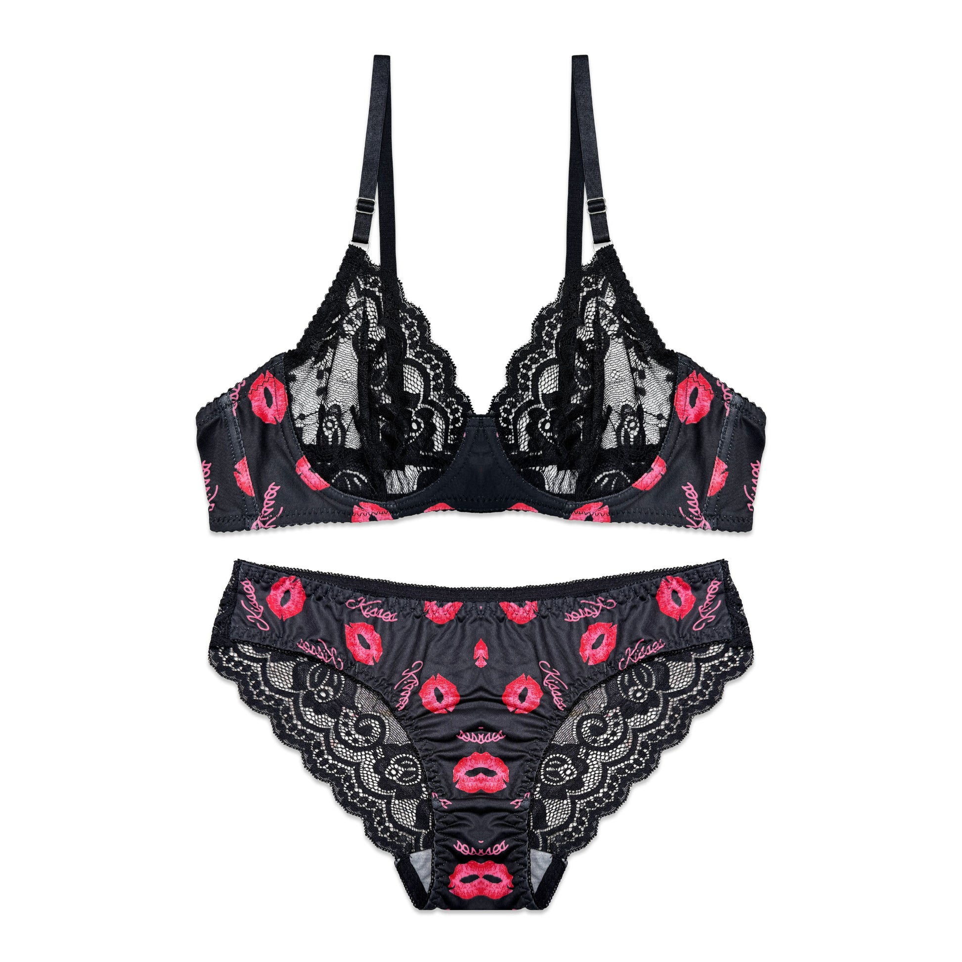 Add a pop of playfulness with the  Cherry Flirt Set. This fun and flirty lingerie duo features vibrant kiss prints and love-script details on a sleek black base, paired with delicate lace for a romantic touch. Perfect for moments filled with charm, confidence, and a little cheekiness.