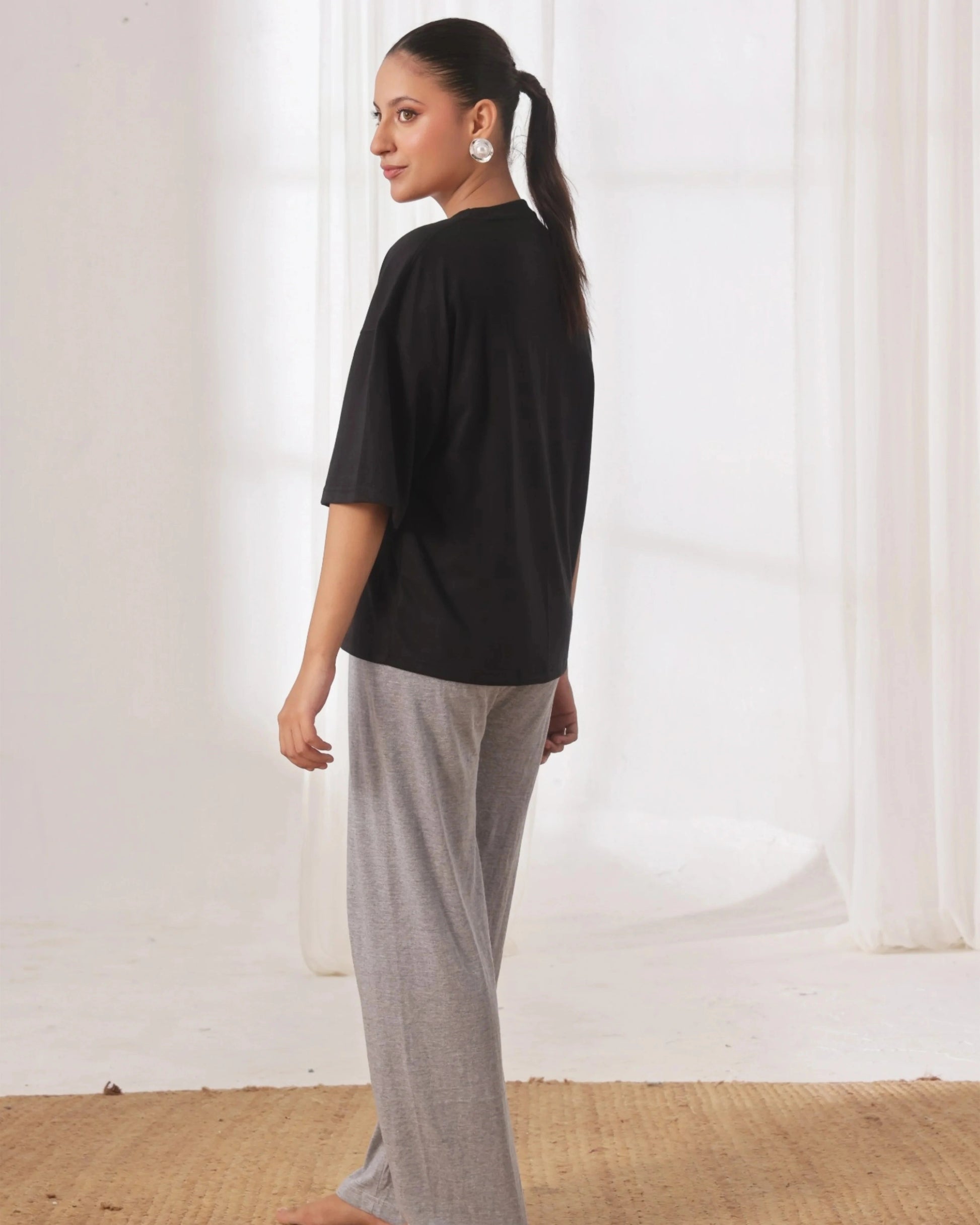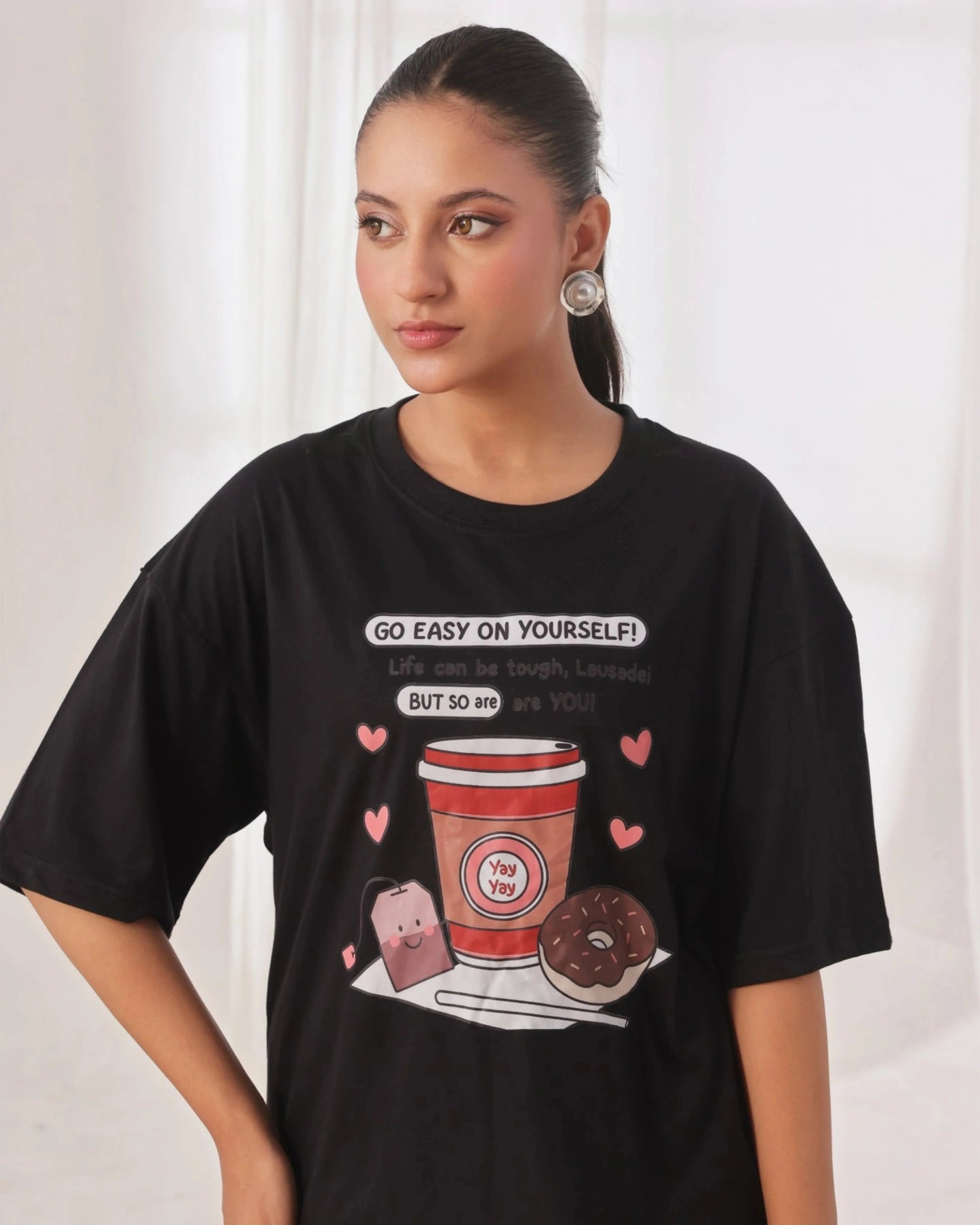 Spread good vibes and cozy comfort with the Go Easy Graphic Tee. Made with soft, breathable fabric and a relaxed oversized fit, this T-shirt is perfect for lounging or casual wear. The adorable front print delivers a sweet reminder to be kind to yourself — featuring a coffee cup, donuts, and a positive message to brighten your day.