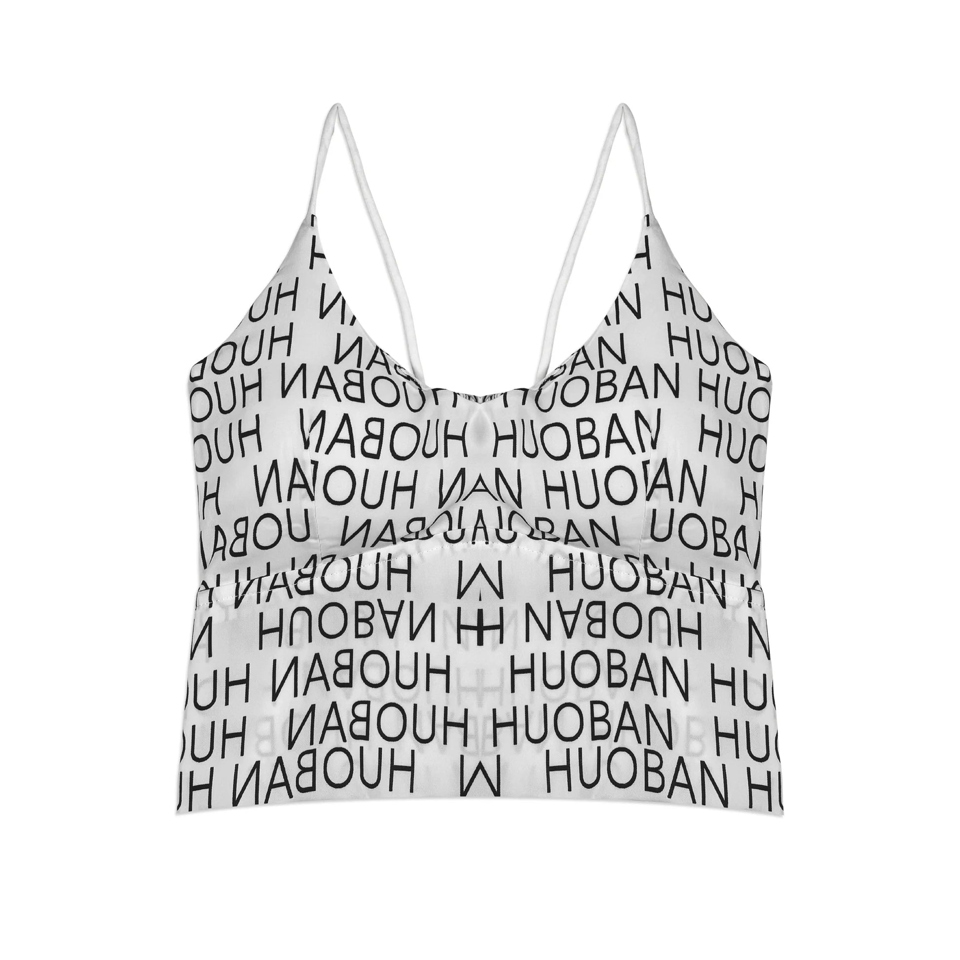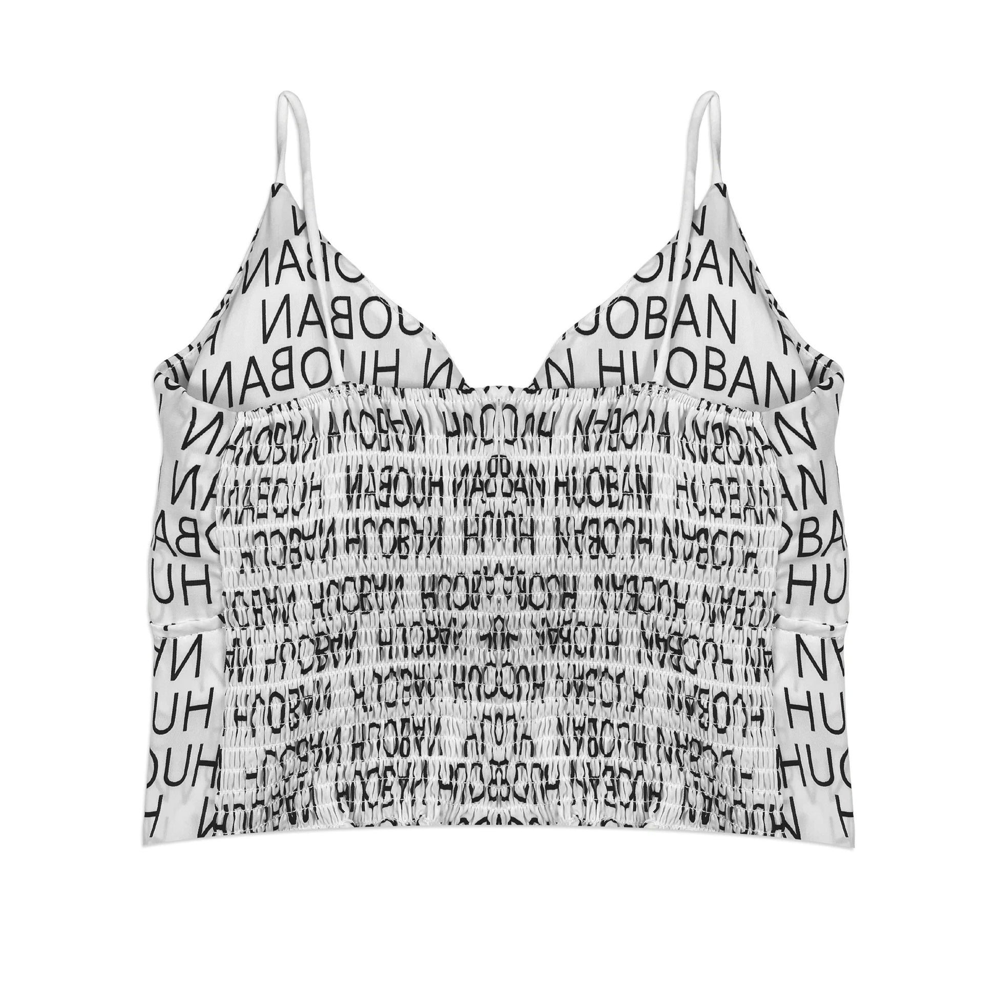 Stand out in the Huoban Echo Bralette – a contemporary piece that fuses bold branding with everyday ease. The repeating “HUOBAN” print creates a rhythmic pattern that adds visual energy, while the soft white fabric and ruched center front bring subtle shaping. Designed with a fully smocked back and thin white straps, this bralette offers all-day comfort with a snug, flexible fit – perfect for styling solo or under open layers.
