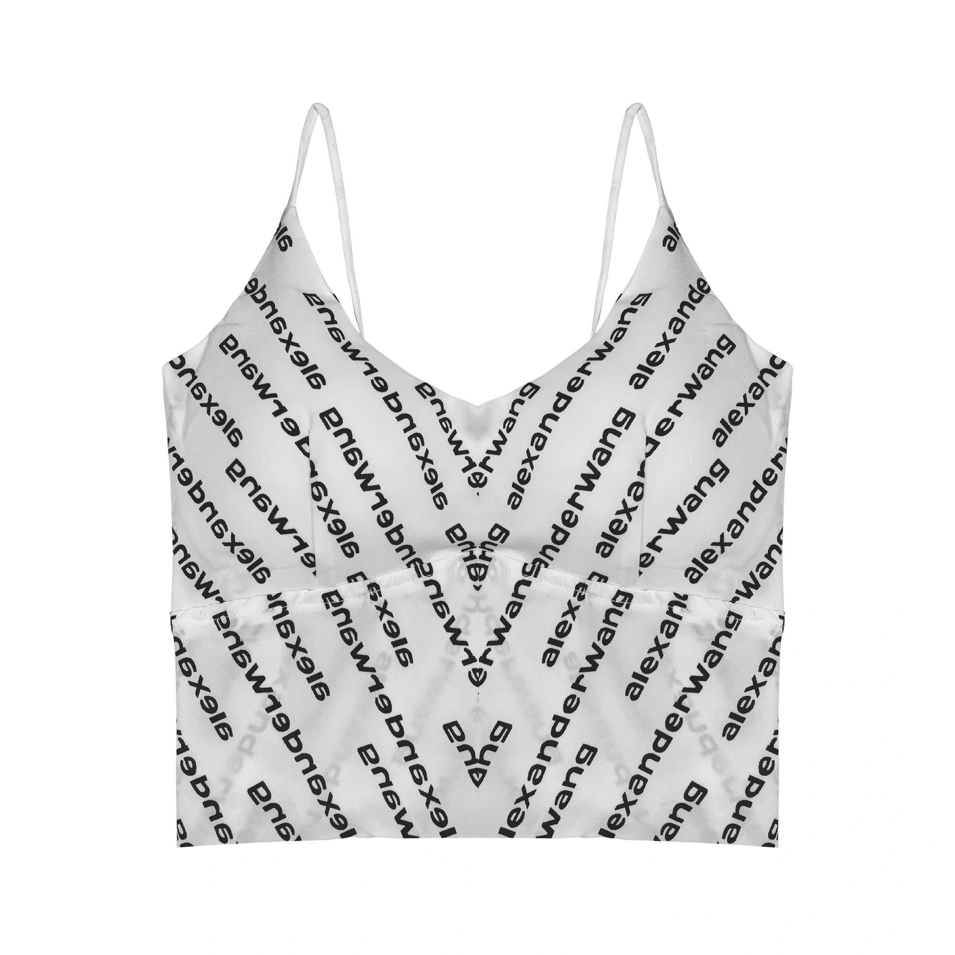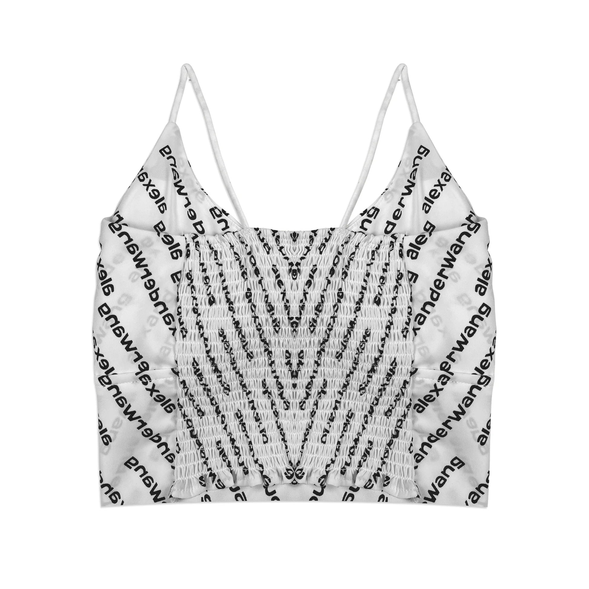 Make a modern statement with the Script Ease Bralette – a sleek and stylish piece featuring an all-over diagonal logo print in bold black against crisp white. Designed for both comfort and visual impact, this bralette boasts delicate spaghetti straps and a V-neckline, while the ruched front and fully smocked back provide a secure and flattering fit. Whether styled alone or layered under your favorite jacket, this piece brings fashion-forward energy to any outfit.