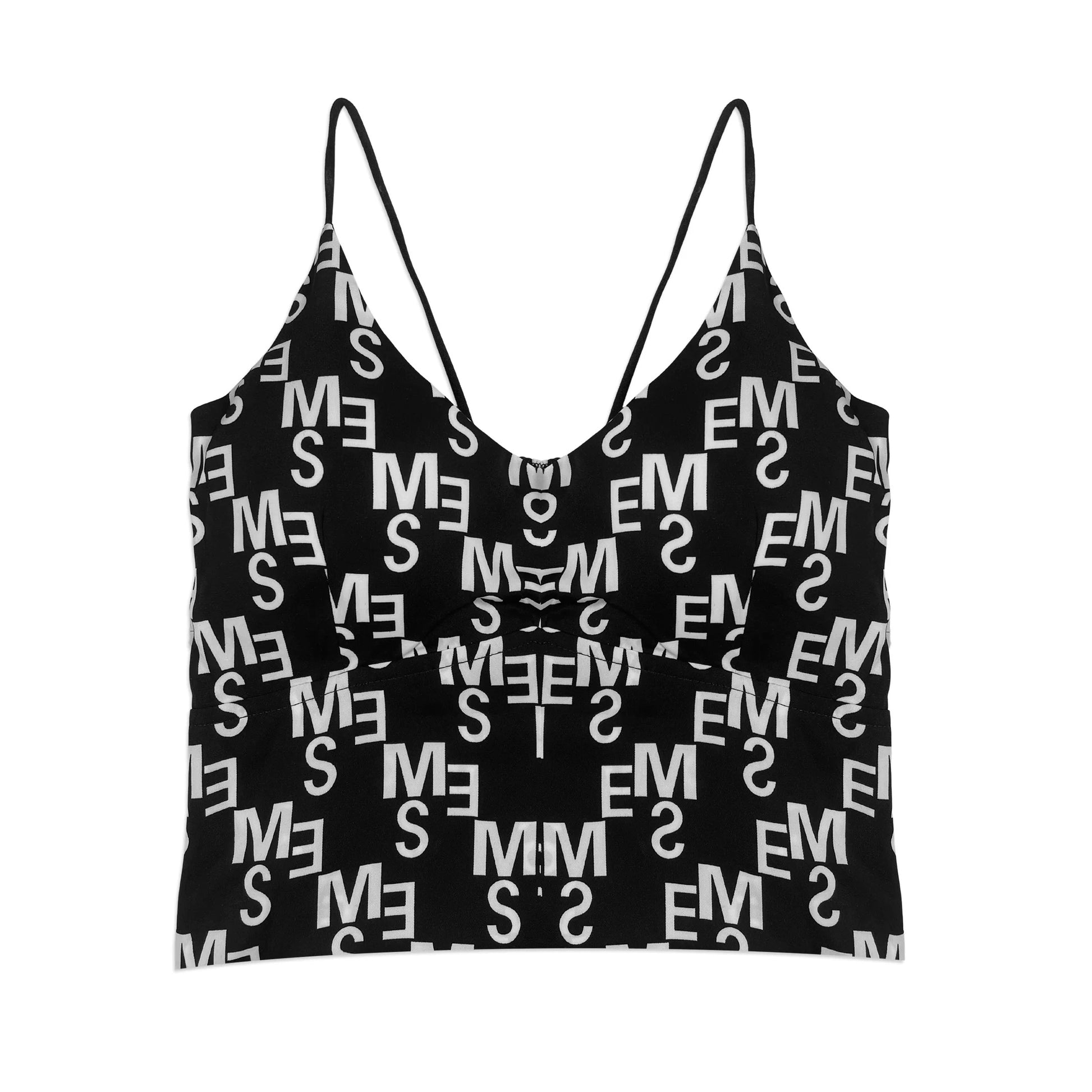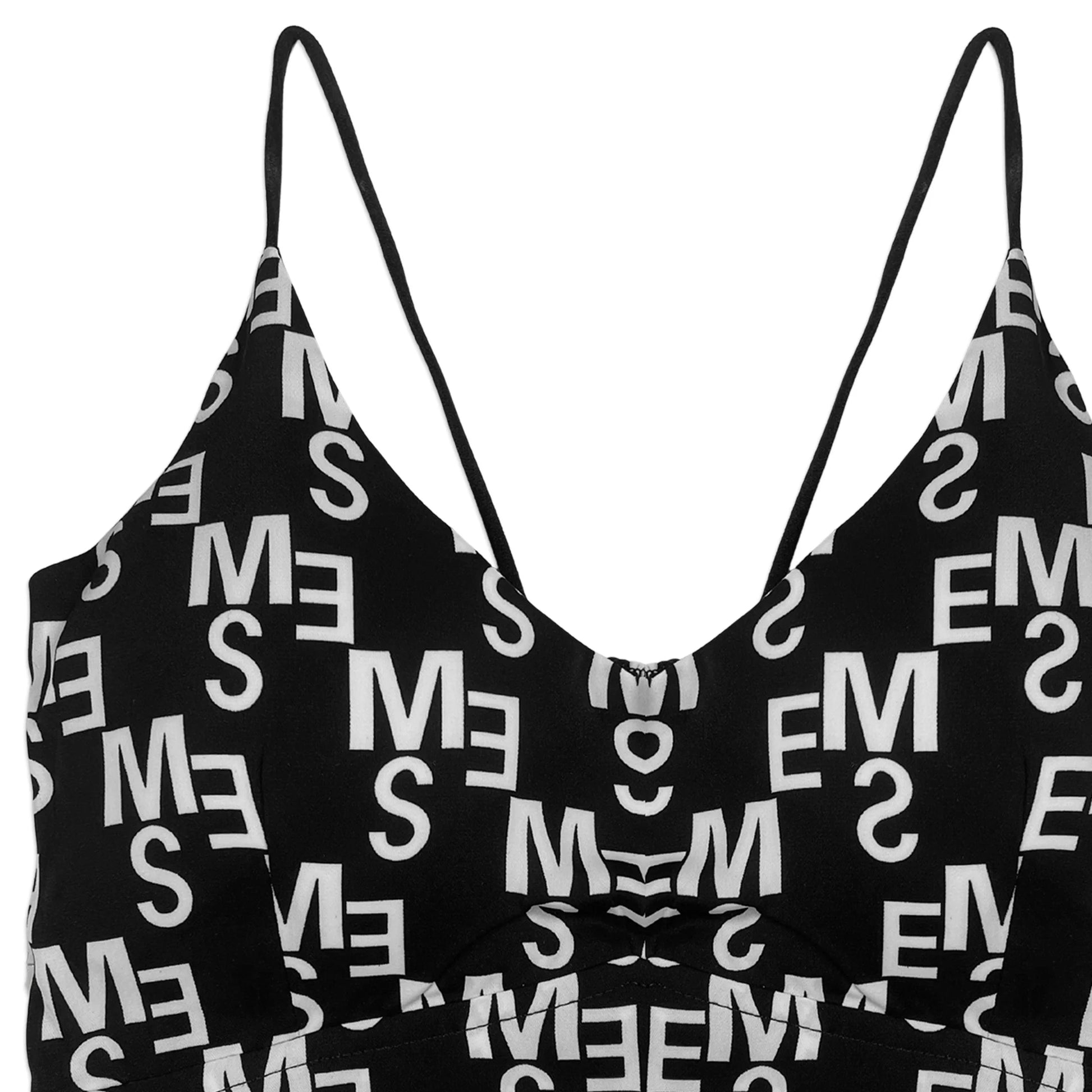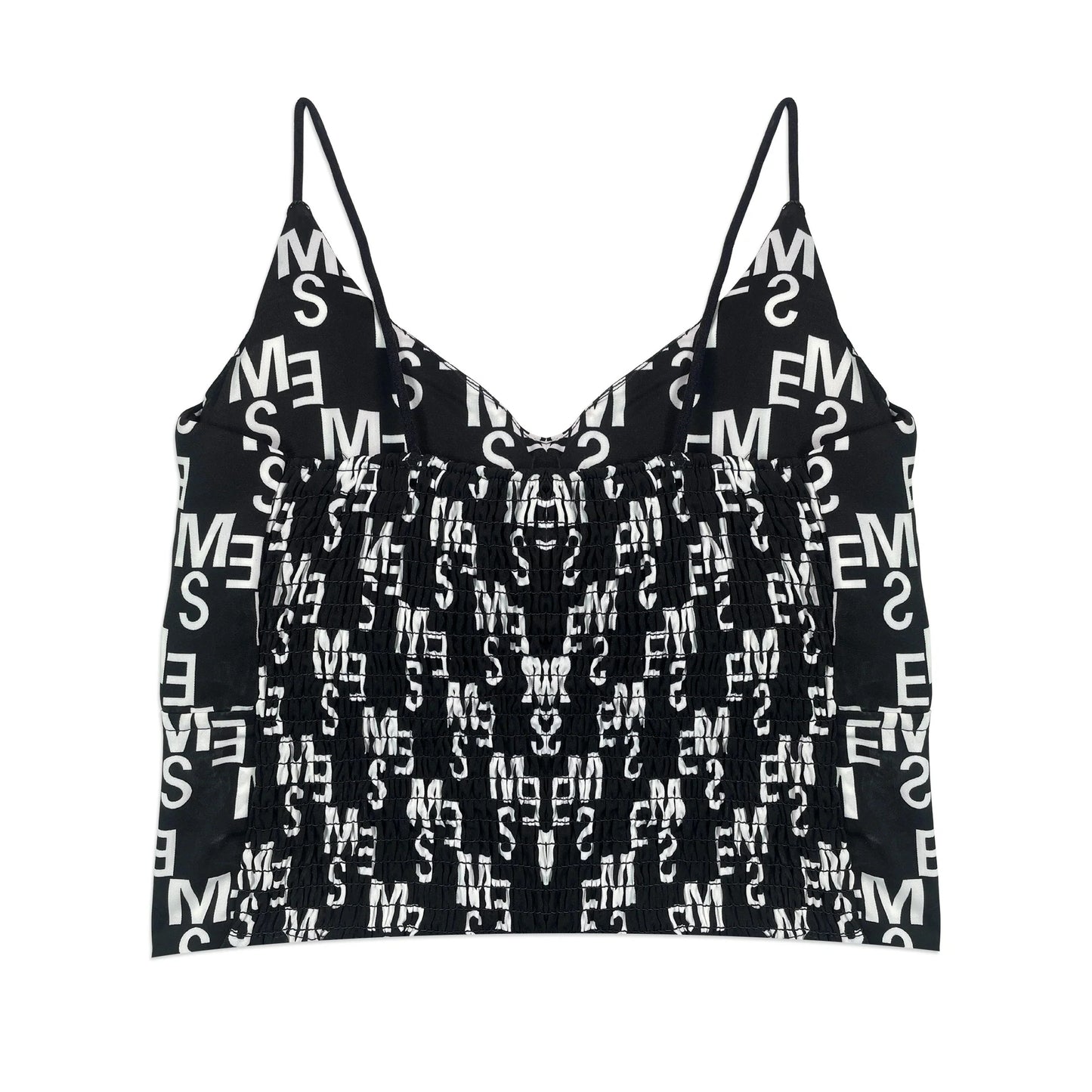 Turn heads with the Typora Curve Bralette – a bold blend of graphic edge and modern comfort. Featuring an all-over monochrome text print with a playful mirrored layout, this statement piece is crafted from stretchable fabric and designed with delicate spaghetti straps and a soft ruched front. Its smocked back ensures a flexible, snug fit that moves with you, making it perfect for layering or wearing solo on warm days.