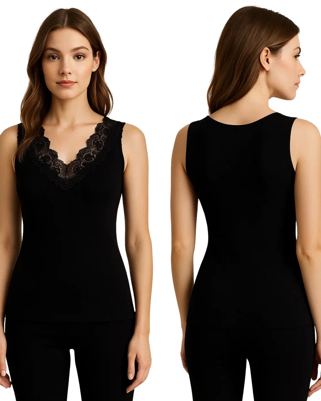 Elevate your everyday style with the Velva Lace Trim Tank. Designed with a flattering V-neckline adorned with delicate lace, this sleeveless black top blends elegance and comfort effortlessly. Its soft, stretchy fabric hugs your figure gently, making it perfect for layering or wearing on its own from day to night.