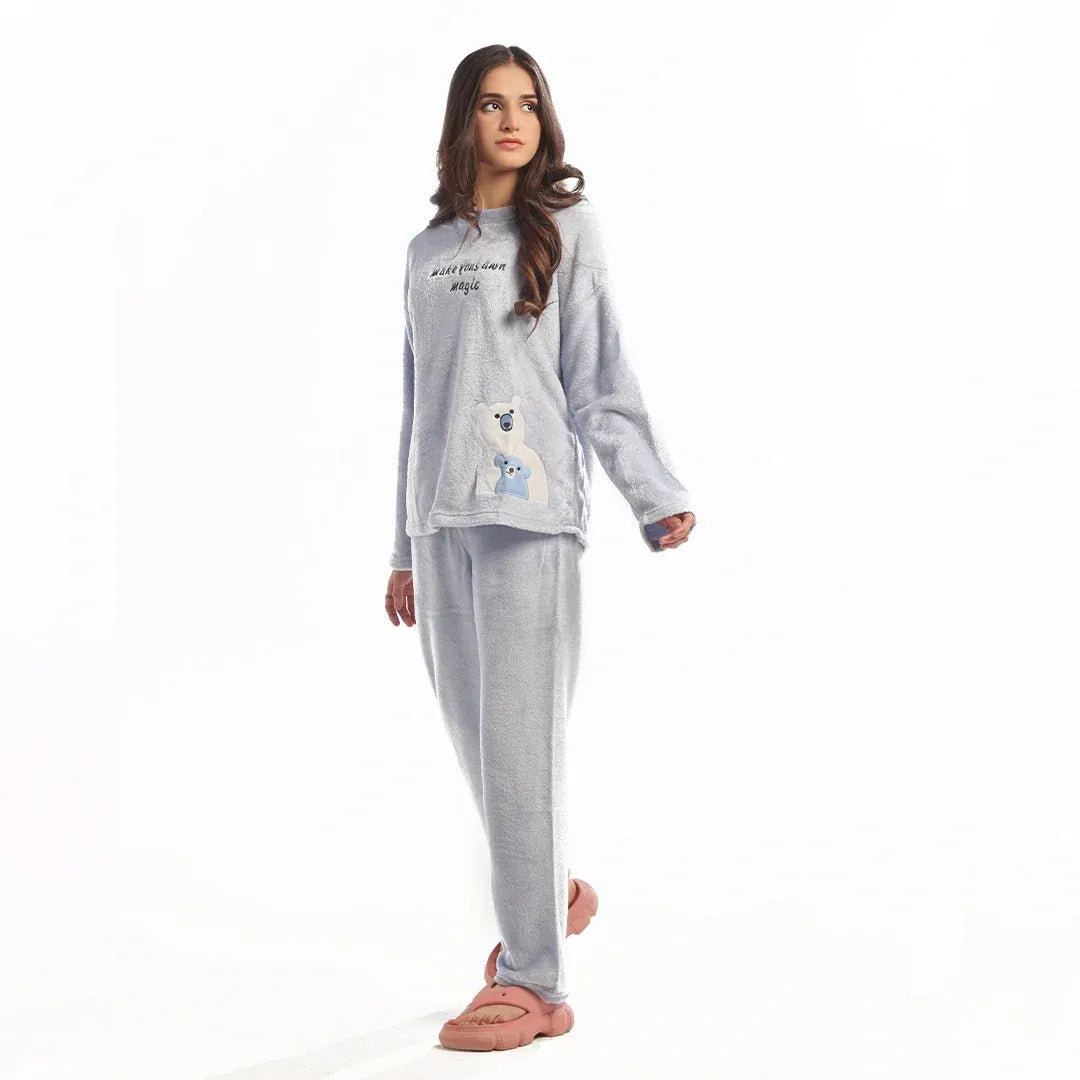 The Fleece Pajama Suit in Baby Blue. This long-sleeve pajama set is made from ultra-soft fleece, perfect for keeping you warm on chilly winter days and nights. Featuring a cute teddy design, it adds a fun and playful touch to your sleepwear collection.