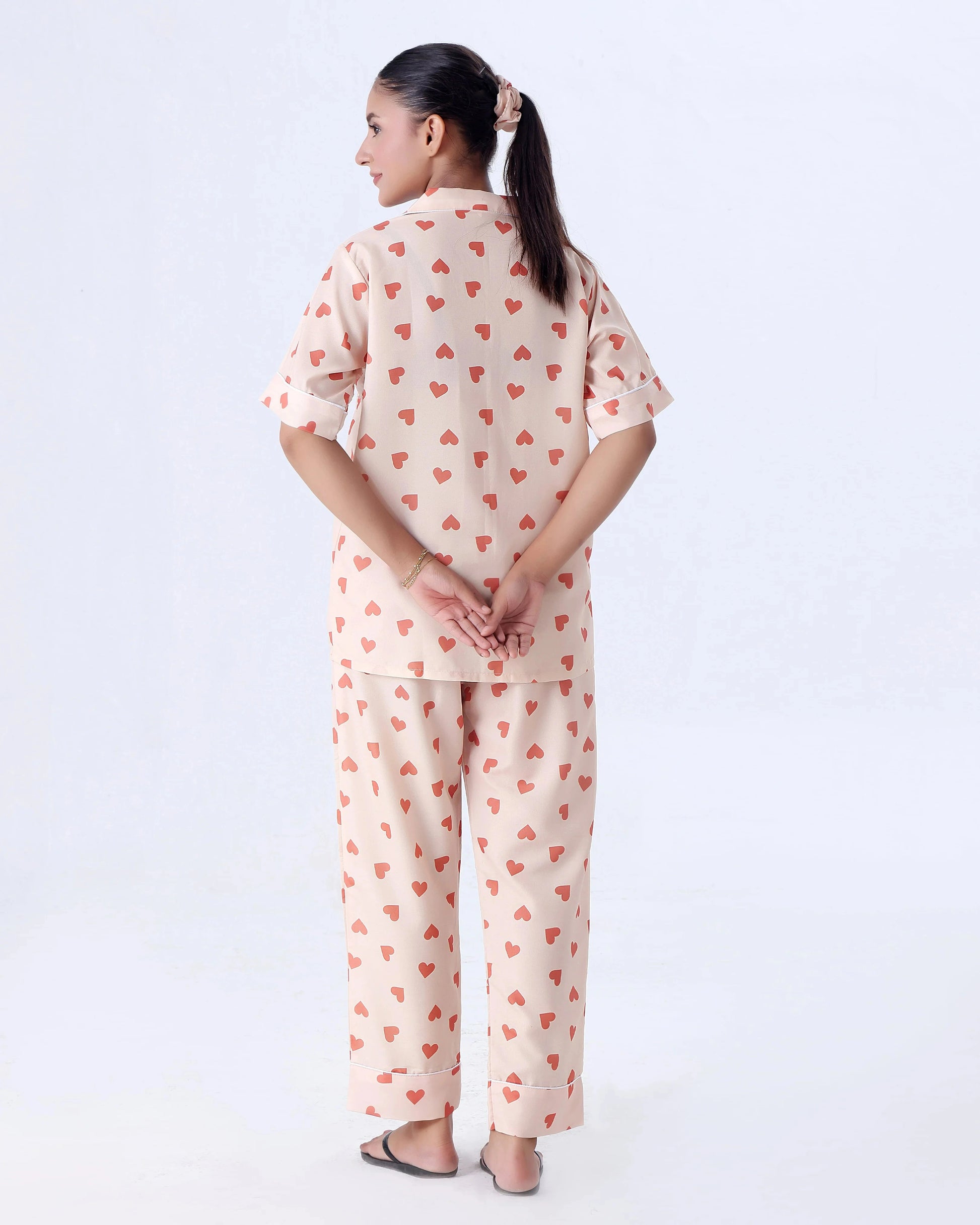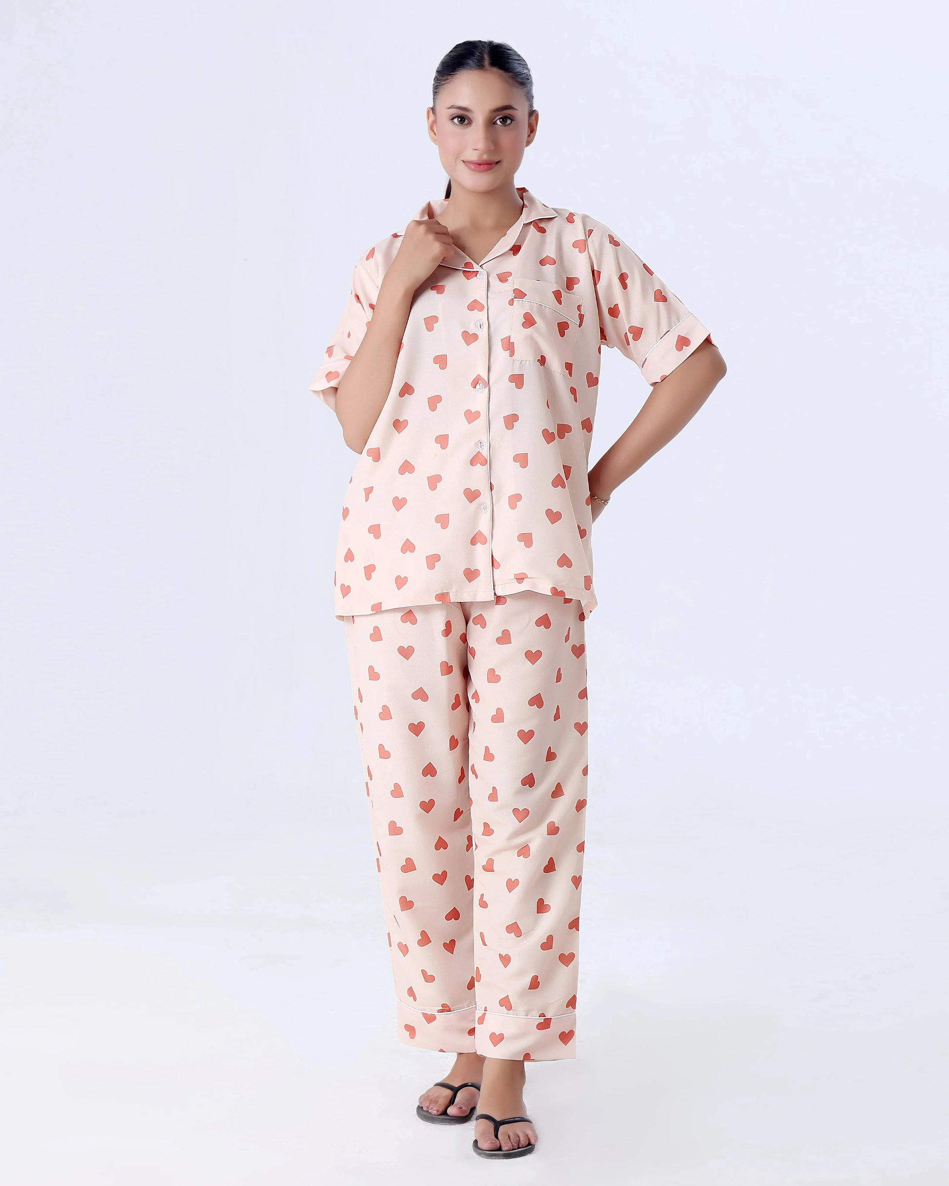 Delicate and dreamy, the SoftDot Sheer Pajama Set features a soft white base sprinkled with tiny black polka dots. Crafted from lightweight, semi-transparent fabric, this full-sleeve set offers a breezy, barely-there feel  ideal for warm nights or indoor lounging. Its clean design and sheer elegance make it a perfect blend of simplicity and charm.