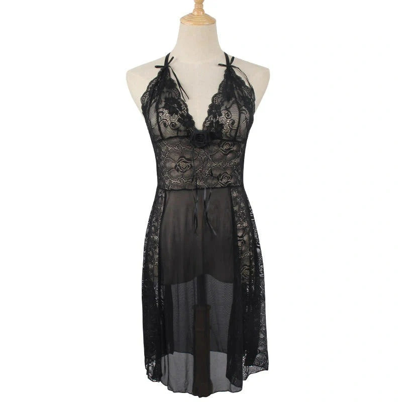 Indulge in the allure of elegance with the Babydoll – Midnight Rose. Crafted from delicate floral lace and sheer mesh, this halter-style piece features a plunging neckline, dainty satin bows, and a charming rose applique at the center. The flowy, see-through skirt adds a touch of mystery, making it the perfect choice for romantic evenings or simply feeling fabulous at home.