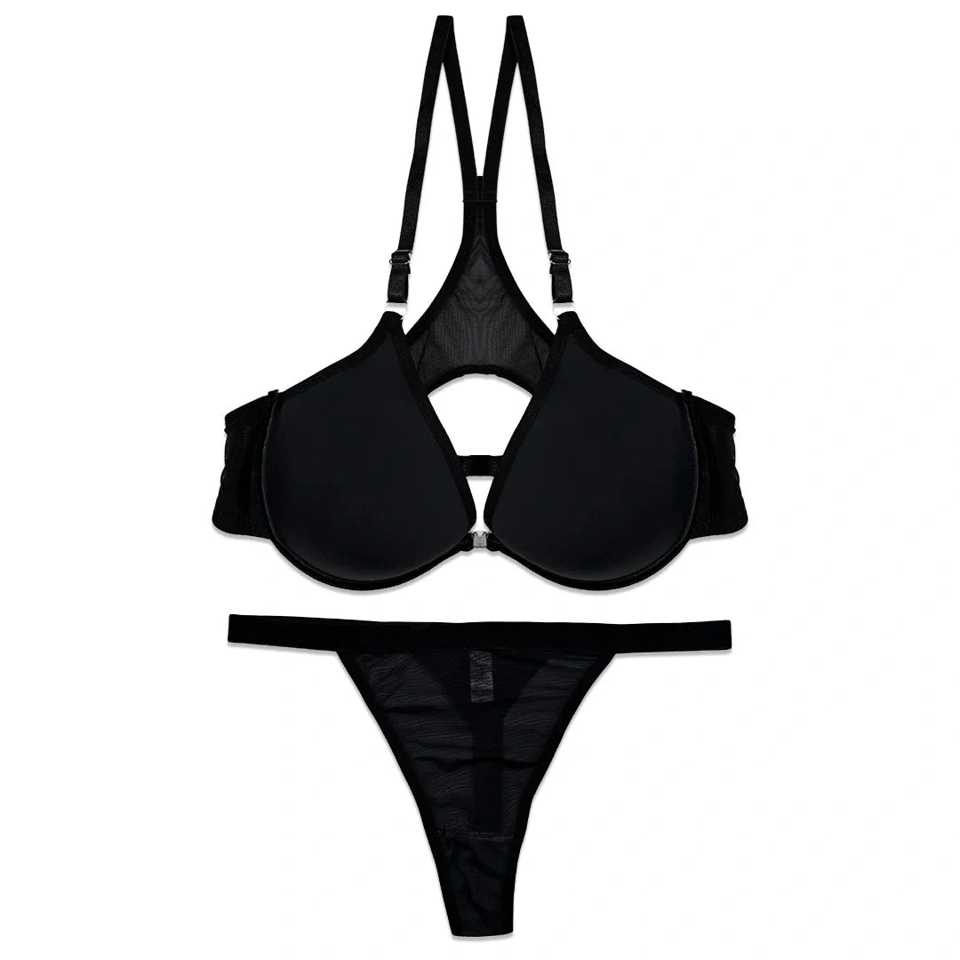 Front Flair is designed to add ease and style to your lingerie collection. This front-open black bra with matching thong gives a smooth, modern look with ultimate comfort. Whether you're dressing up or down, it fits right in