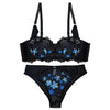 Delicate yet daring, the Catnight Blue Dusk Set blends sheer sensuality with floral charm. Featuring soft blue flowers scattered over sheer black mesh, and trimmed with lace, this underwired bra and thong duo is designed to captivate with subtle elegance and playful boldness.