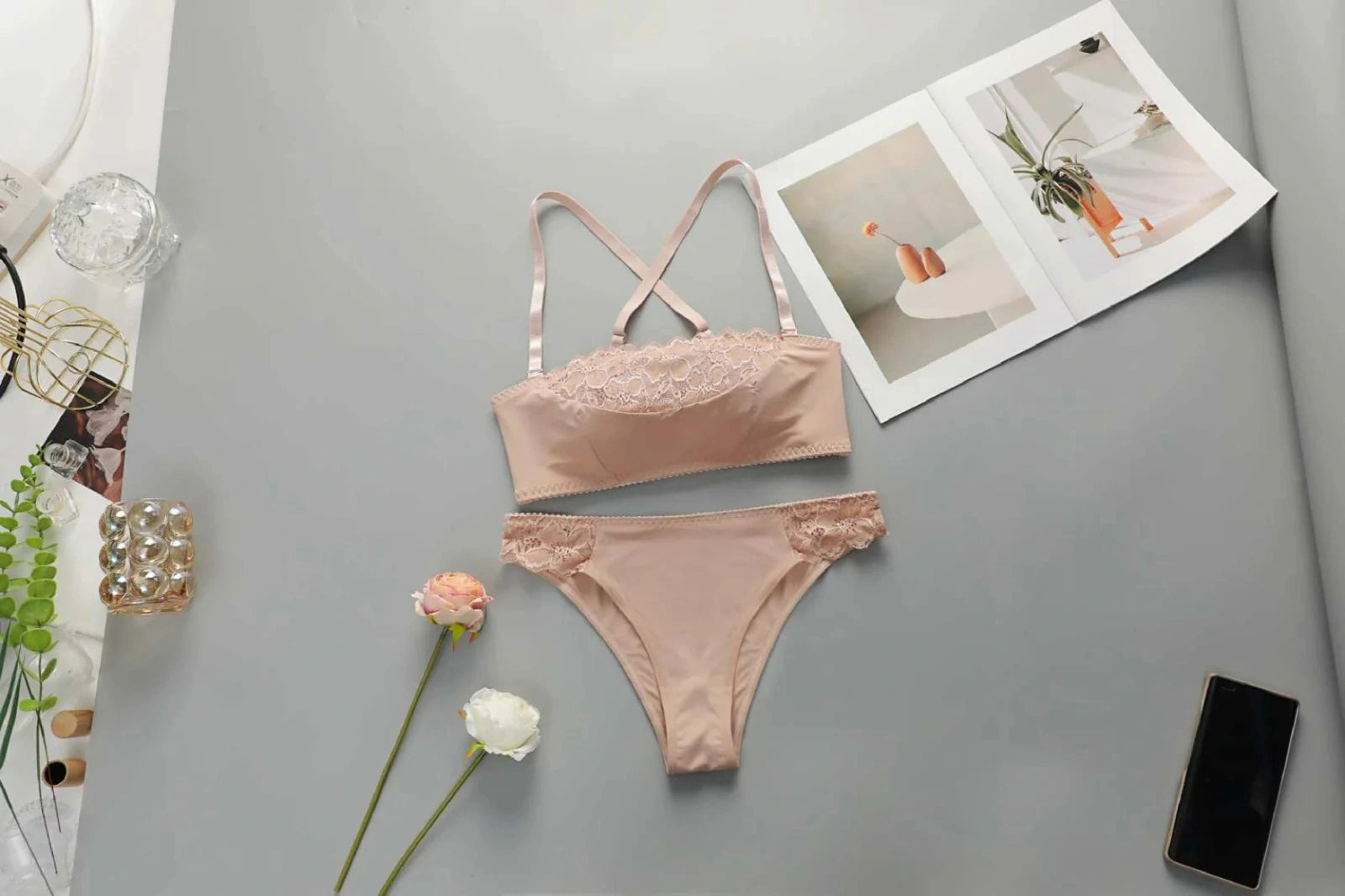 The Lace Delight is a soft and stylish lingerie set that perfectly combines comfort and elegance. Its soft light pink satin fabric, along with the delicate floral lace detailing, gives it a graceful and sophisticated look. The bralette features lace design with crisscross straps, adding a modern touch. This set is perfect for those who seek elegance and comfort in their daily wear.