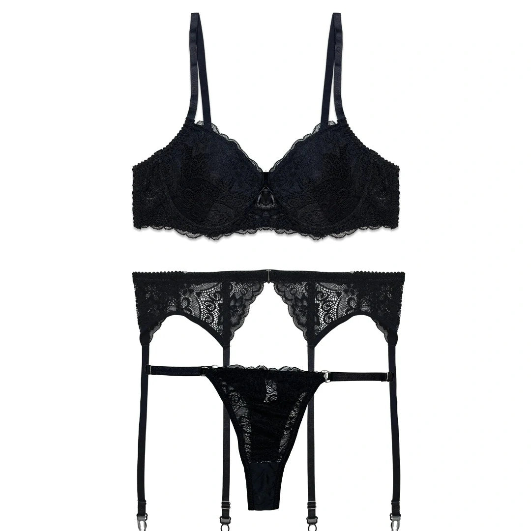 - 3-Piece Set – Bra, thong, and matching garter belt