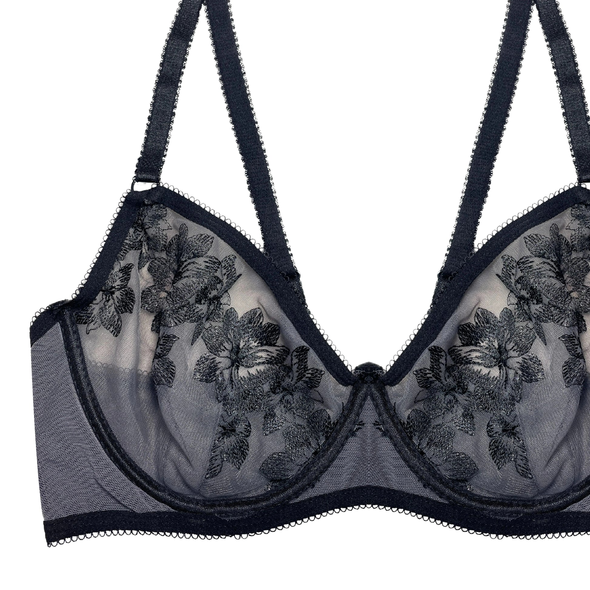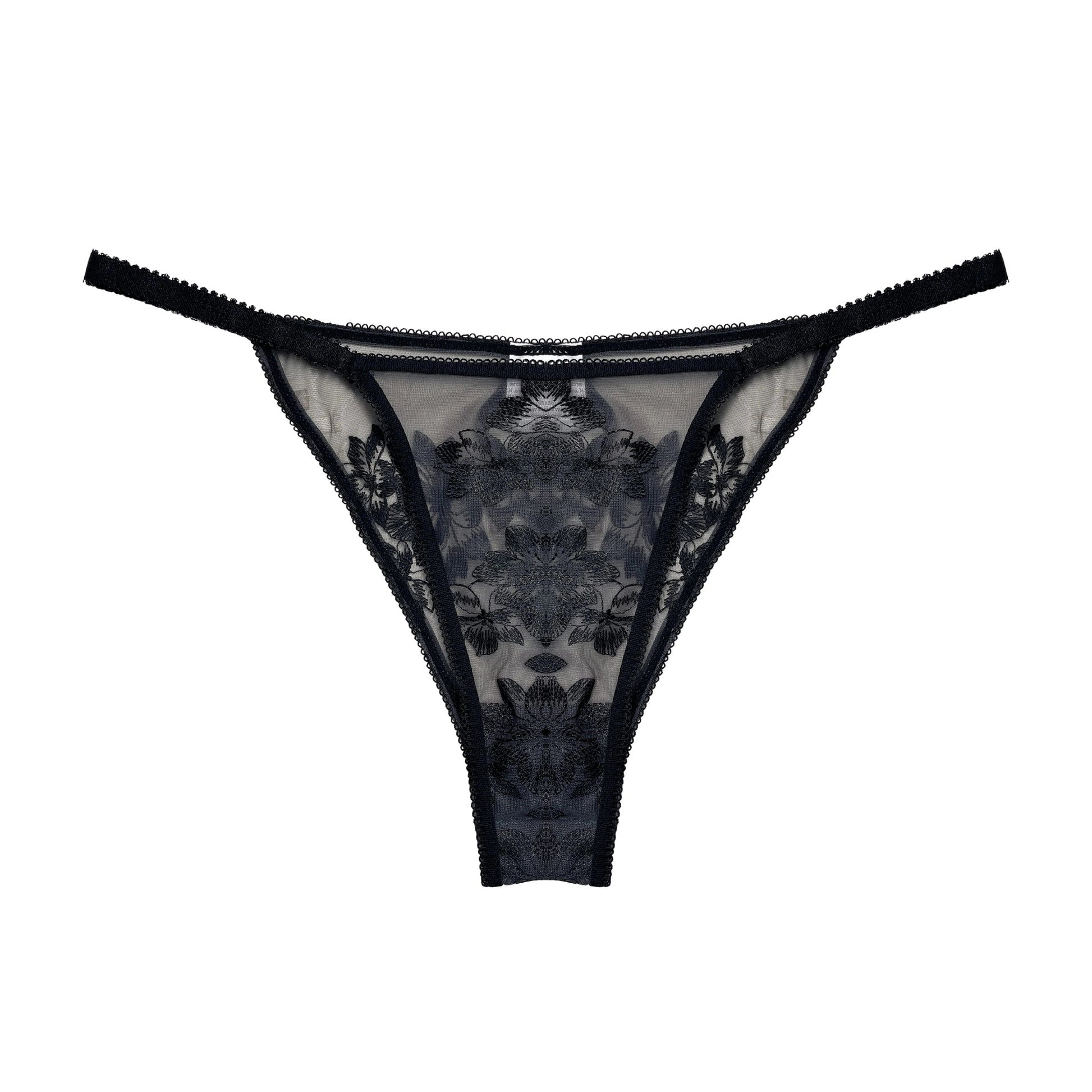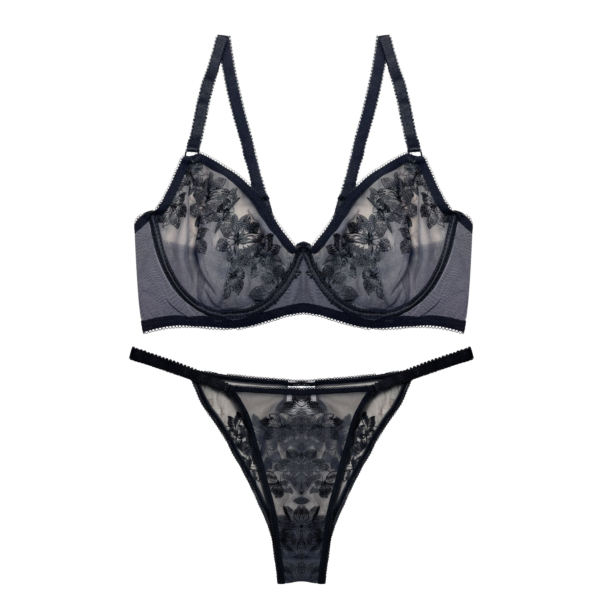 Elegant and effortlessly sultry, the Petale Obscura Set features black floral embroidery on sheer mesh — a statement of pure allure. With a soft, non-padded bra and matching thong, this set is made for those who love subtle sensuality with a refined finish.