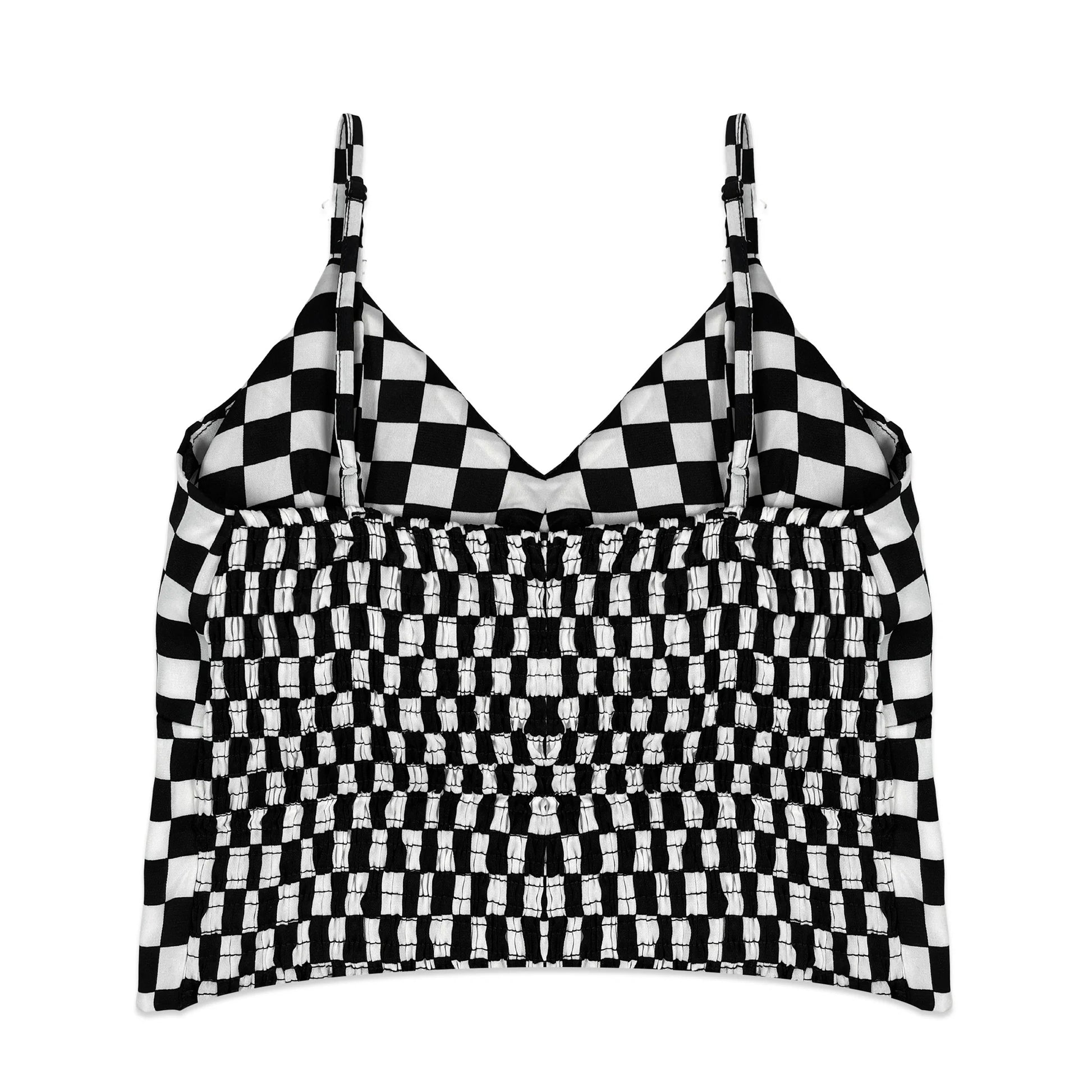 Turn heads with the bold charm of the Zerna Bralette. Featuring a striking black-and-white checkered design, this piece blends street-style edge with everyday ease. Crafted from soft, stretchable fabric and finished with adjustable straps and a smocked back, it offers both comfort and a flattering fit. Whether styled solo or layered under a jacket, Zerna makes a confident statement.