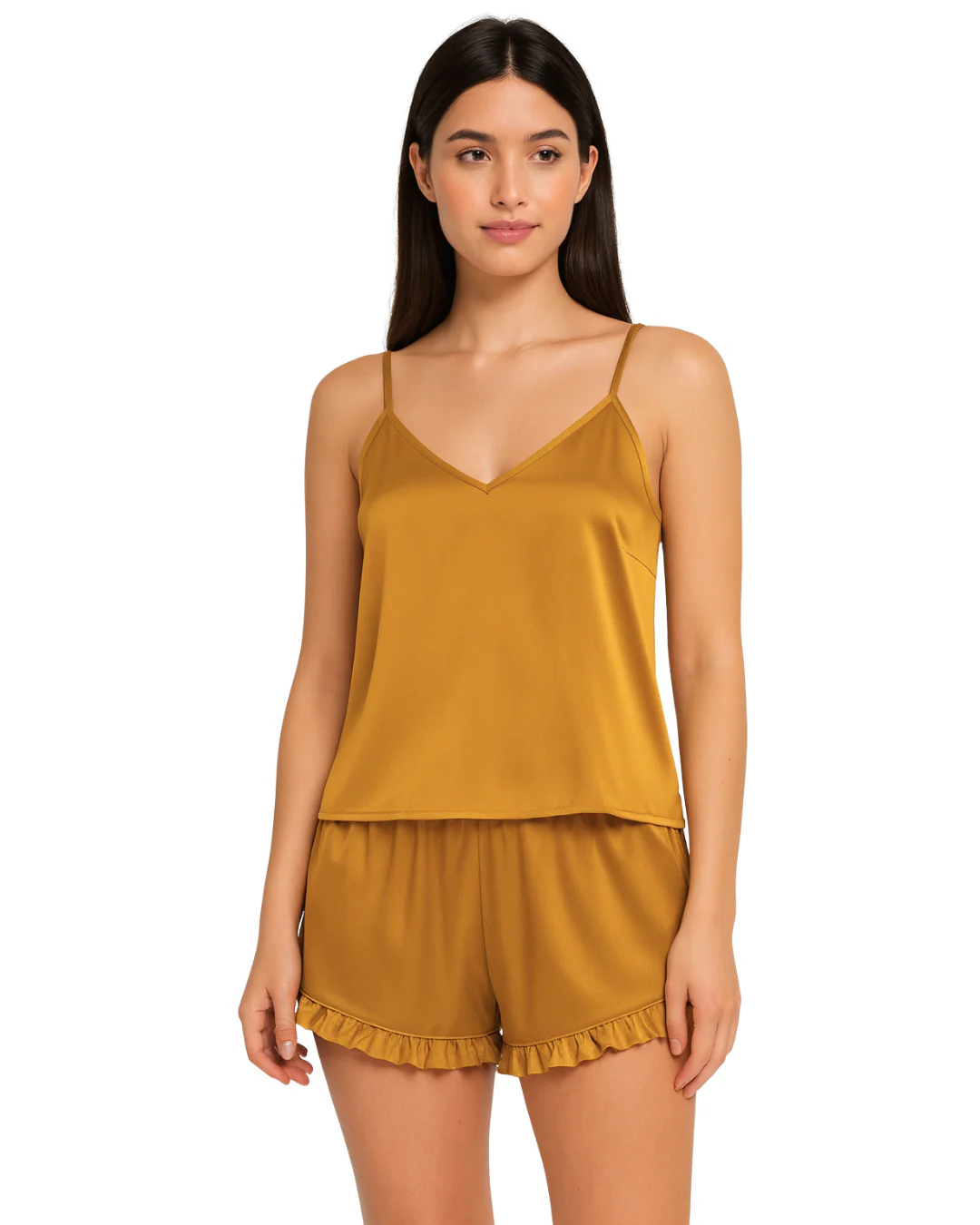 The matching shorts are designed with an elastic waistband for a flexible fit and adorned with a soft ruffled hem that adds a touch of playfulness. The elegant shimmer of the fabric and rich jewel-toned color make this set feel upscale, while the breathable, lightweight material makes it ideal for warm weather or indoor relaxation.