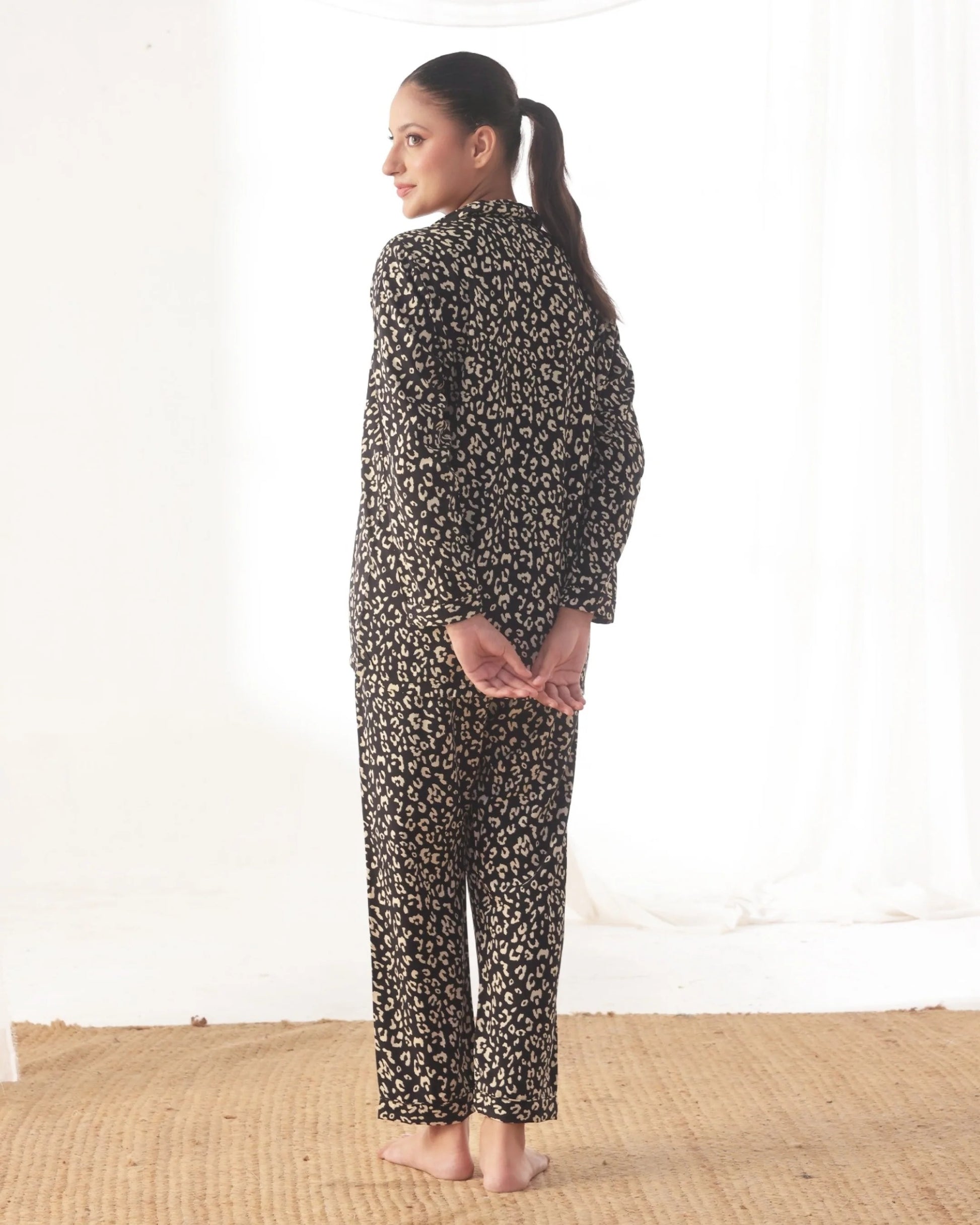 Unleash your bold side with the Wild Lounge Pajama Set, a statement piece that blends fierce fashion with all-day comfort. Crafted with a soft, breathable fabric, this leopard-print suit adds a daring touch to your nightwear collection—perfect for lounging in confidence or enjoying a restful night’s sleep.