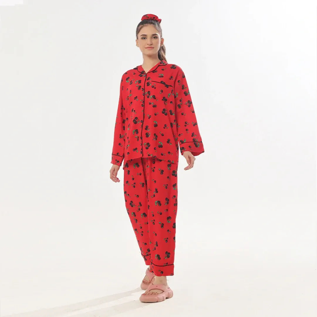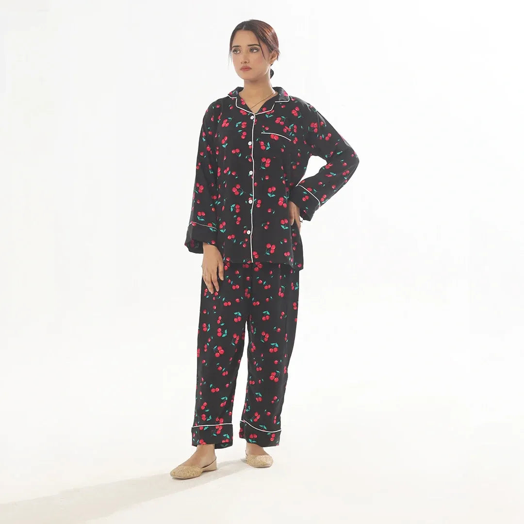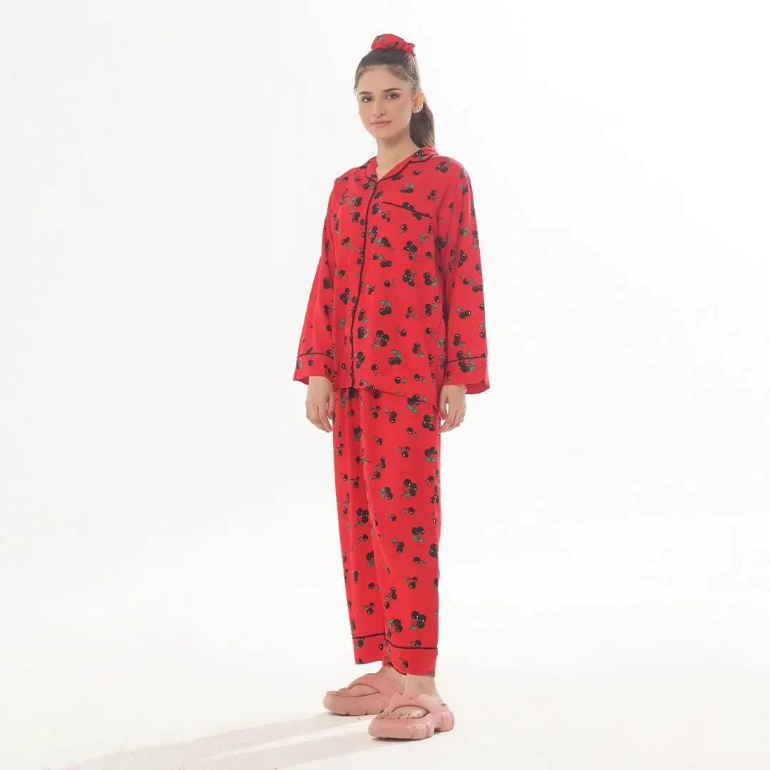 Refresh your sleepwear collection with this elegant and cozy cherry linen pajama suit for a night of luxurious rest
