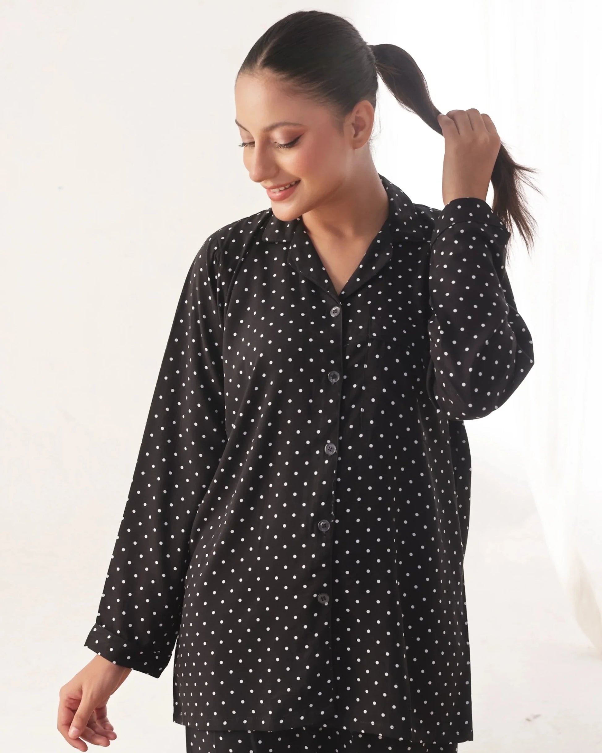 The Dot Drape Pajama Set blends classic charm with cozy comfort. Featuring a timeless black base adorned with white polka dots, this full-sleeve set offers a playful yet elegant look. Crafted from soft, breathable fabric, it ensures a relaxed fit ideal for both nighttime rest and laid-back lounging.