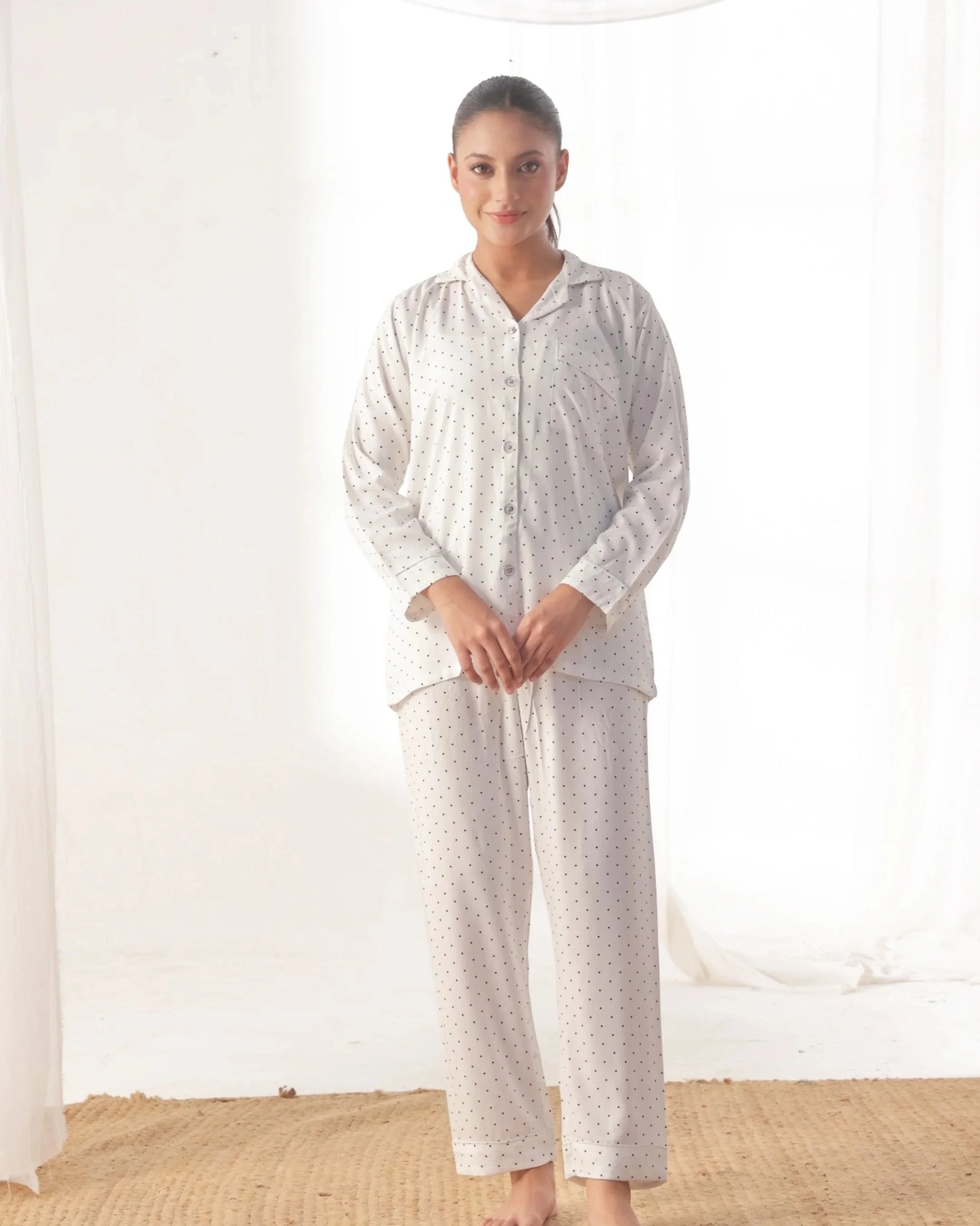 Delicate and dreamy, the SoftDot Sheer Pajama Set features a soft white base sprinkled with tiny black polka dots. Crafted from lightweight, semi-transparent fabric, this full-sleeve set offers a breezy, barely-there feel ideal for warm nights or indoor lounging. Its clean design and sheer elegance make it a perfect blend of simplicity and charm.