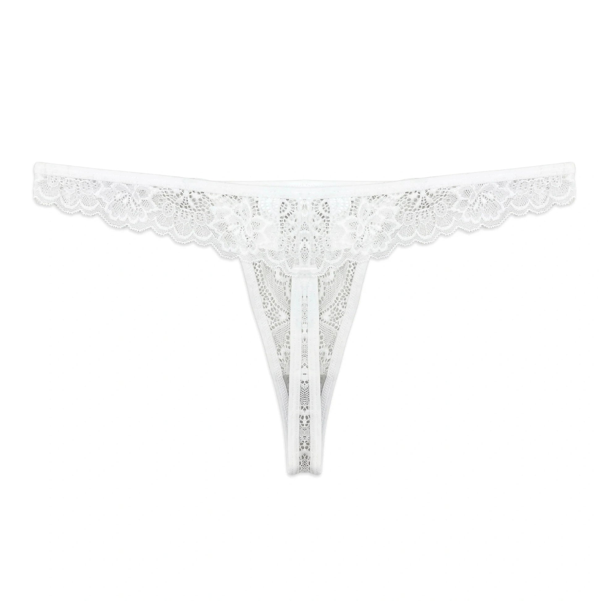 Delicate and daring, this white lace thong panty blends elegance with a barely-there feel. Crafted from soft floral lace, it offers a lightweight and breathable fit while adding a feminine touch to your lingerie collection. The intricate design and scalloped edges enhance its luxurious appeal—perfect for everyday wear or special moments.